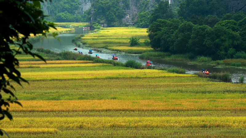 Nếu bạn thích đồng quê yên tĩnh với những cánh đồng lúa chín vàng thì hãy đến Tam Cốc, Bích Động, Ninh Bình vào mùa này. Khắp nơi lúa chín vàng óng vẽ lên một bức ảnh đồng quê với mùi lúa chín vàng thơm. Đến khách Tây còn thảng thốt không lên lời trước vẻ đẹp Tam Cốc mùa lúa chín.