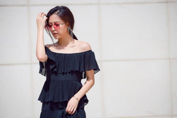Old  Cool Thời trang đầm trễ vai gợi cảm của Hoàng Thuỳ Linh