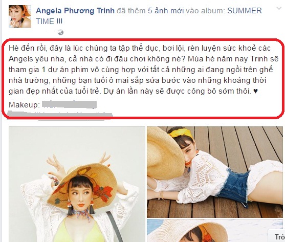 Đi kèm với hình ảnh này, Angela Phương Trinh viết: "Hè đến rồi, đây là lúc chúng ta tập thể dục, bơi lội, rèn luyện sức khoẻ các Angels yêu nha. Cả nhà có đi đâu chơi không nè? Mùa hè năm nay Trinh sẽ tham gia 1 dự án phim vô cùng hợp với tất cả những ai đang ngồi trên ghế nhà trường, những bạn tuổi ô mai sắp sửa bước vào những khoảng thời gian đẹp nhất của tuổi trẻ. Dự án lần này sẽ được công bô sớm thôi".