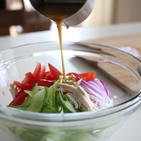 Nguyên liệu làm nước trộn nộm: 1,5 muỗng canh mù tạt vàng (có thể điều chỉnh tùy khẩu vị); 2 muỗng canh đường; 2 muỗng canh giấm; 1 muỗng canh xì dầu; 1 muỗng cà phê tỏi băm; ít dầu mè