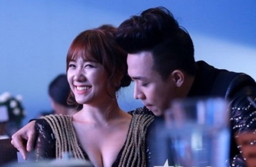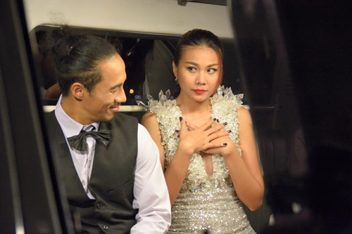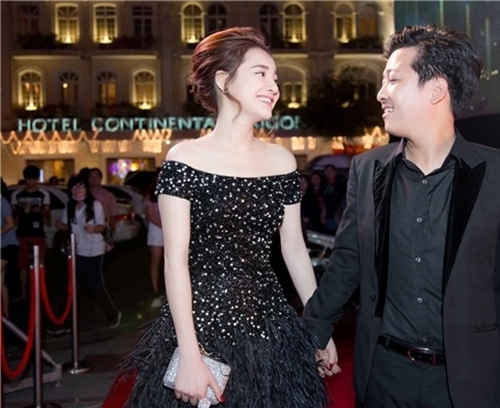 Hiếm hoi lắm Nhã Phương mới mặc gợi cảm thế này dự sự kiện, Trường Giang vừa trò truyện vừa đưa mắt nhìn vòng một của bạn gái.