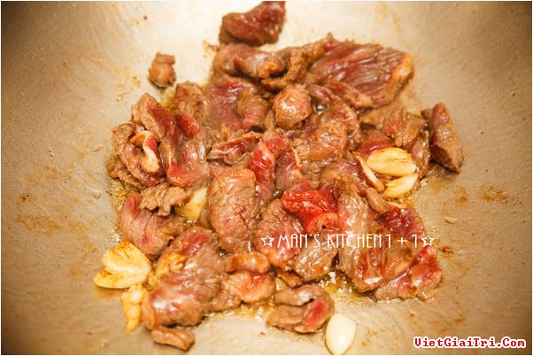 - Bước 2: Lấy chảo, đổ dầu ăn vào, cho tỏi vào xào thơm rồi cho thịt bò vào xào khoảng 6 phút.