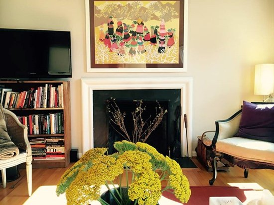 Phòng khách với hoa thơm, lò sưởi nằm trong tông màu ấm.