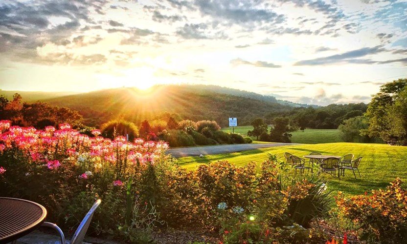 Phía sau trang trại là vườn hoa, tiếp giáp với đồi thoải, núi non cùng cảnh sắc thiên nhiên tuyệt vời của vùng này.