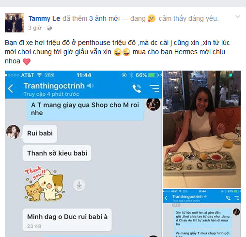 Ngoài ra, cô còn đăng loạt tin nhắn Ngọc Trinh xin đồ lên Facebook nữa. Tuy nhiên, ai cũng có thể thấy là 2 cô gái này thân nhau như chị em, có xin đồ như vậy cũng là hết sức bình thường. Tammy Lê cũng chỉ trêu Ngọc Trinh như vậy thôi!.