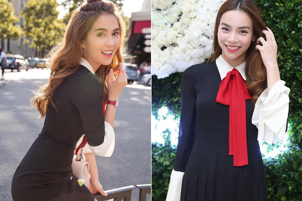 Tuy nhiên không ít người nhận ra sự tương đồng giữa chiếc váy của Ngọc Trinh và váy Gucci Hà Hồ từng mặc trước đó. Điểm chung lớn nhất của hai mẫu váy này là cách pha màu giống hệt nhau, đặc biệt là ở các chi tiết nơ cổ, ống tay.