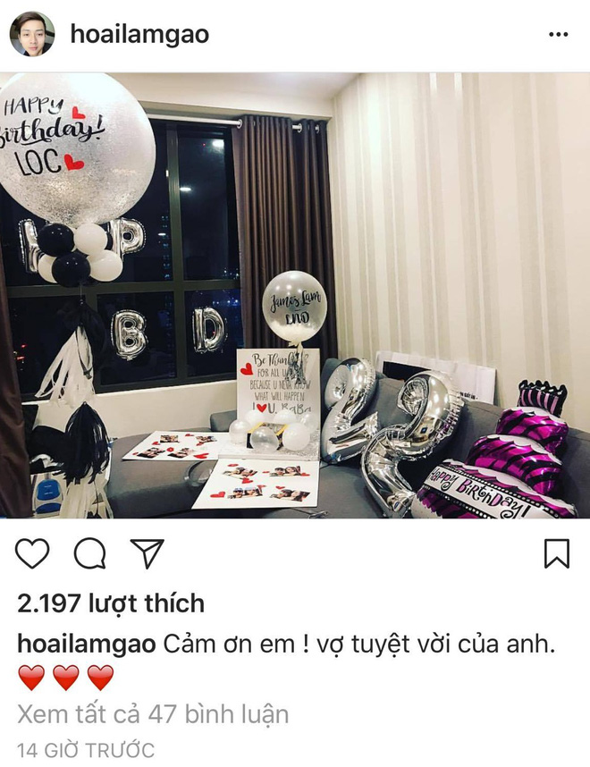 Mới đây, trên trang cá nhân của mình, Hoài Lâm đã chia sẻ cảm xúc với người hâm mộ về khoảnh khắc đón tuổi mới bên cô bạn gái xinh đẹp Lư Hoàng Bảo Ngọc: "Cảm ơn em! Vợ tuyệt vời của anh". Kèm theo đó là khung cảnh lãng mạn gồm bóng bay và nhiều món quà đặc biệt do đích thân "vợ tương lai" của nam ca sĩ chuẩn bị.