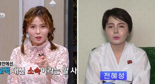 Lim Ji-huyn (trái) trong một chương trình truyền hình Hàn Quốc và Jeon Hye-sung trong video tuyên truyền của Triều Tiên