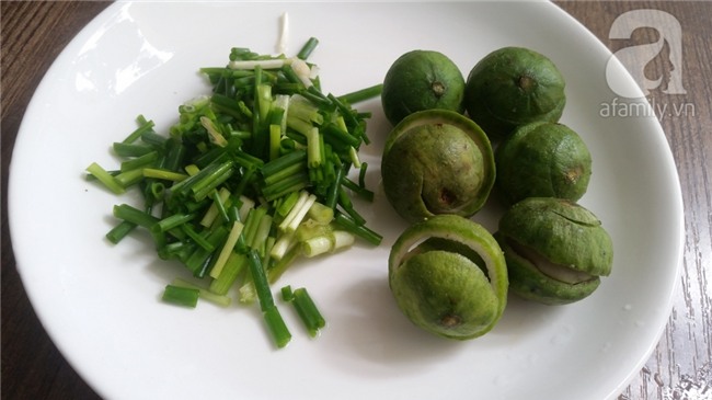 Sấu cạo vỏ, gọt khoanh tròn. Hành lá cắt khúc.