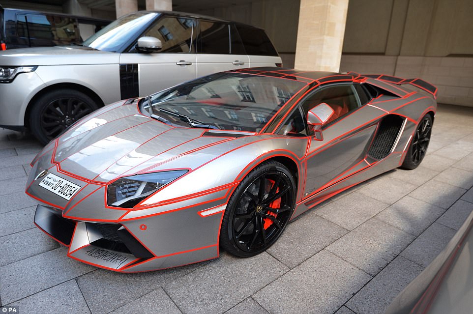 Ngoài ra, còn có một chiếc Lamborghini bạc với đường kẻ màu đỏ, có giá tới 192.000 bảng Anh (5,8 tỷ đồng) và một chiếc Brabus 4x4, có giá tới 240.000 bảng Anh (7,2 tỷ đồng), đỗ bên ngoài khách sạn Dorchester .