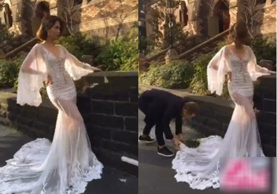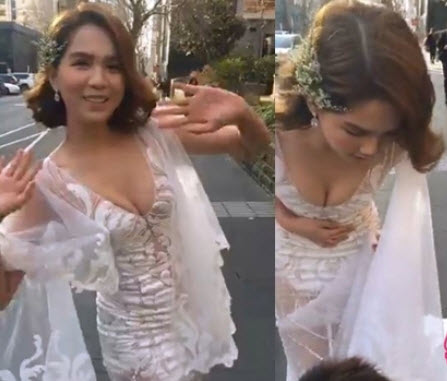 Mới đây, Ngọc Trinh bị bắt gặp trên đường phố Melbounre, Úc trong trang phục váy cưới xuyên thấu. Nhiều người bất ngờ và tò mò khi nhìn thấy nữ hoàng nội y.