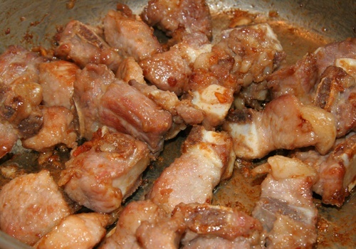 - Đến khi thấy miếng sườn vàng, thịt sườn săn lại thì cho phần nước mắm ngọt đã pha vào cùng.