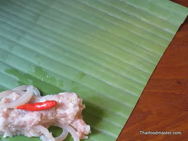 Tùy thuộc vào kích cỡ cây nem bạn muốn làm, dùng thìa trải hỗn hợp thịt ở một góc của miếng lá chuối 20 x 20 cm. Đặt lên miếng nhân nem ớt một trái ớt hiểm và cuộn nem lại như trong ảnh.