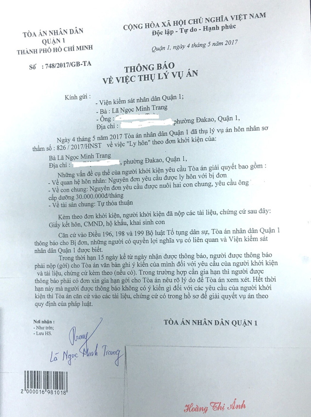 Minh Trang gửi đơn kiện chồng cũ đến tòa án nhân dân quận 1.