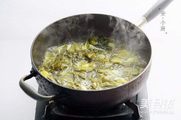- Đổ nước vào nồi, nêm muối, hạt tiêu, đường, giấm, hạt nêm vào nồi, khuấy đều.