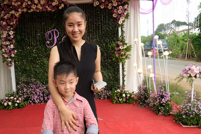 Gia đình diễn viên chuẩn bị kỹ lưỡng từng chi tiết nhỏ như chiếc nơ tím đính trên quai ly hay bình nước in thông tin buổi lễ.