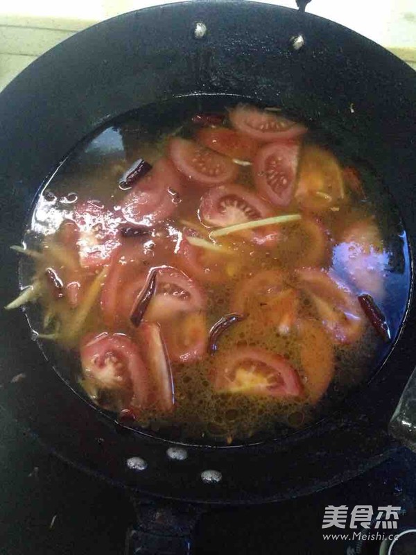 - Làm nóng dầu trong nồi, cho gừng, tỏi, ớt và cà chua vào xào tới khi thơm.