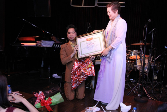 Ngọc Sơn từng quỳ tặng tấm bằng khen phong tặng anh là Giáo sư âm nhạc cho mẹ.