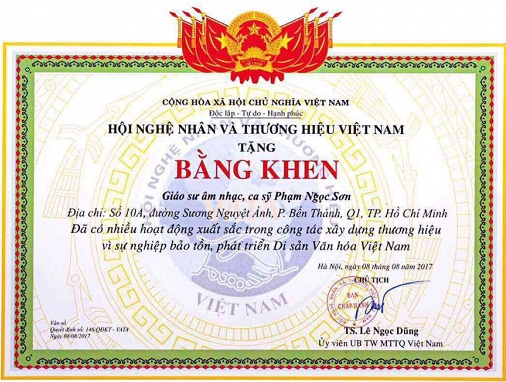 Đại diện ca sĩ Ngọc Sơn vừa có thông tin gửi báo chí cho biết: “Nam ca sĩ vui mừng khi được Hội Nghệ nhân và Thương hiệu Việt Nam tặng bằng khen vì có những hoạt động xuất sắc trong sự nghiệp bảo tồn, phát triển di sản văn hóa Việt Nam. Bằng khen này phong tặng cho anh danh hiệu Giáo sư âm nhạc".