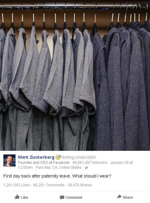 Cũng giống như Steve Jobs, người sáng lập và CEO của Facebook luôn xuất hiện trước công chúng với cùng một chiếc áo phông màu xám và thêm một chiếc áo hoodie màu nâu. Phong cách thời trang này đã được Mark Zuckerberg mặc từ những ngày đầu tiên tạo ra Facebook, khi anh vẫn còn đang học tại trường đại học.