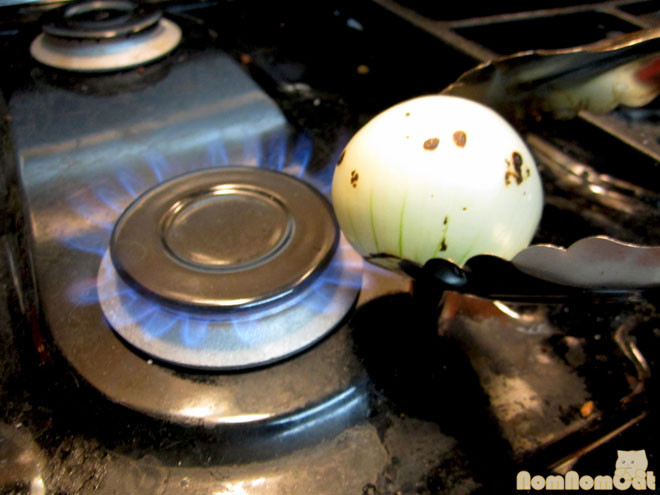 Lột vỏ hành và gọt vỏ gừng. Bật một bếp khác ở lửa to. Dùng kẹp kim loại để giữ chắc hành và gừng. Nướng hành và gừng trên bếp, xoay để lửa phủ đều toàn bộ lớp bên ngoài, nướng đến khi lớp bên ngoài hơi cháy và dậy mùi thơm.