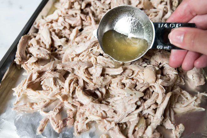 Tắt bếp, vớt đùi gà ra đĩa và xé nhỏ. Trộn thịt gà với chút nước mắm và nước chanh tươi.