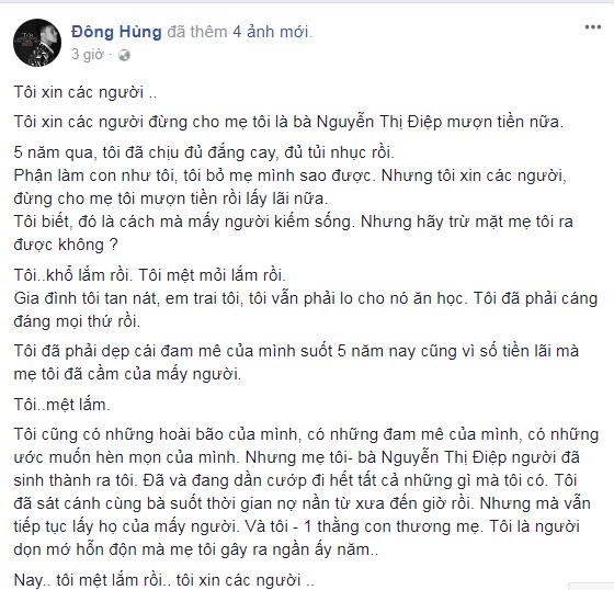 Dòng trạng thái chia sẻ số nợ khổng lồ đang phải gánh thay mẹ của ca sĩ Đông Hùng.
