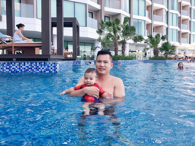 Bé Nu mới 9 tháng tuổi nhưng rất dạn dĩ. Cậu nhóc không hề sợ nước khi được bố ẵm xuống bể bơi.