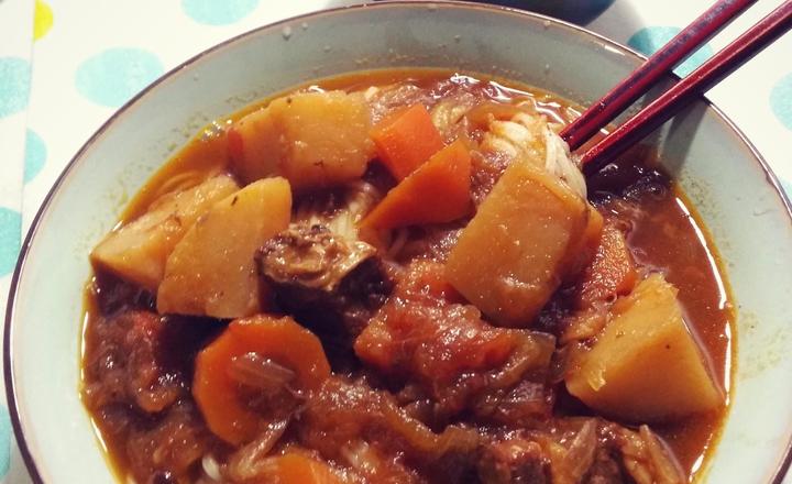 Cà rốt, khoai tây, hành tây cắt miếng to, cà chua chia bốn. Dùng nước nóng tráng qua rồi nhanh tay thả vào nước lạnh, như vậy sẽ dễ bóc vỏ. Lấy 1 chảo dầu khác, đổ dầu và thả hành tây vào đảo thơm, rồi cho cà rốt và khoai tây vào xào đến khi chuyển màu thì cho tiếp cà chua vào đảo thành một hỗn hợp sệt thơm ngây ngất.