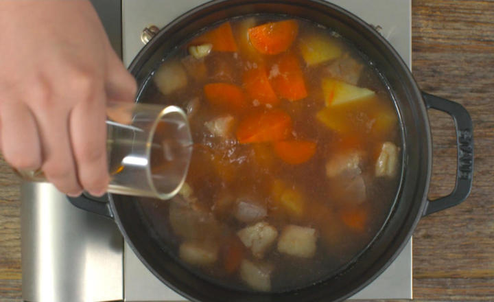 Nồi thịt hầm ở bước 4 sẽ hầm trong vòng 1 tiếng, sau đó đổ phần rau ở bước 5 vào cùng, dùng thìa trộn lên, nêm nếm vị mặn nhạt tùy sở thích rồi sau đó hầm thêm 1 tiếng nữa, đến khi khoai tây nhừ hẳn.
