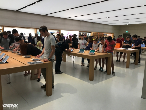 Phía bên trong cửa hàng, hoạt động kinh doanh vẫn diễn ra hoàn toàn bình thường. Các mẫu iPhone trưng bày vẫn đang là iPhone 7, 7 Plus hoặc SE. Theo như tôi nói chuyện với 1 Apple Genius, các mẫu iPhone mới sẽ chỉ được trưng bày vào thời điểm bán ra.