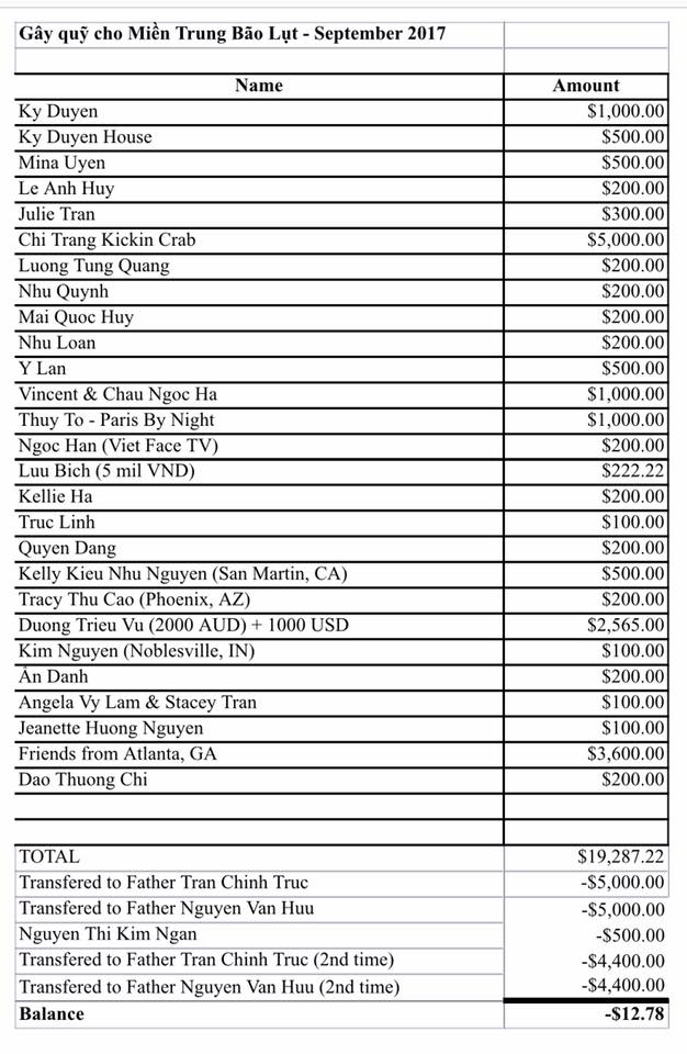 Ngày mai Kd về Mỹ nên hôm nay xin đóng đóng sổ cứu trớ và công bố số tiền Kd nhận được của bạn bè để giúp những đồng bào bão lụt miền trung. Tổng cộng là $19,287.22 USD. Tất cả số tiền này Kd chia làm hai và gởi cho hai vị Linh Mục ở Nghệ An và Quảng Bình để các vị thay mặt chúng ta đi đến những nơi thật xâu xa, hẻo lánh, nghèo đói, bị bão đánh nặng nhất với những phần quà trao tận tay và không đi quá bất cứ trung gian nào. Trong số tiền này Kd có trích ra $500 nhờ em Kim Ngân chuyển cho vài người già cơ cực và một ít quà trung thu cho các học sinh nghèo.