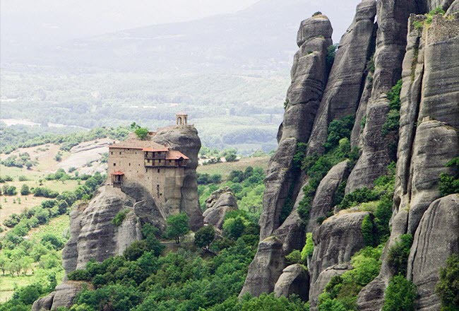 Các tu viện Meteora được xây dựng trên vách núi dựng đứng để chống lại những cuộc xâm lược. Khoảng 22 hay 24 tu viện được xây dựng qua các thời kỳ và nhiều công trình đã trở thành phế tích và ngày nay chỉ còn lại 6 tu viện.