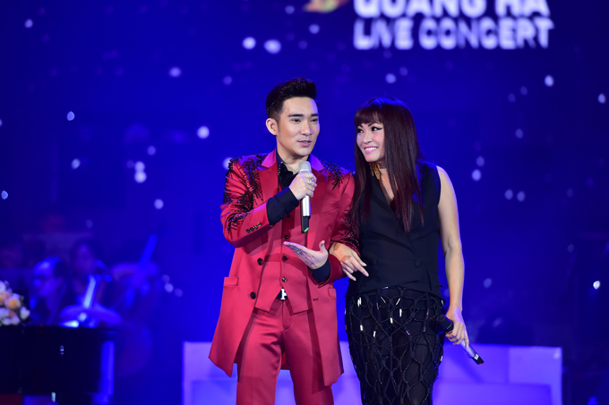 Cũng trong show diễn, Quang Hà còn có phần song ca riêng với Phương Thanh trong 'Hỡi người tình', 'Trống vắng'.