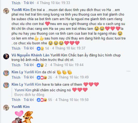 Facebooker Yunmi Kim động viên Kim Lý: “Em trai à…muốn đạt được tình yêu đích thực với Hà…em phải mở hết trái tim, rộng lượng. Tình yêu thương của em trai giành cho bé Subeo nhiều như tình em giành cho Hà. Hà là người mẹ tình cảm với con trai. Nếu em suy nghĩ thoáng chút xíu ở cách ứng xử thì chị tin chắc Hà sẽ yêu em trai nhiều lắm. Là phụ nữ họ luôn coi trọng tình yêu giành cho con và cho bạn trai là ngang nhau. Cố lên em nhé. Sau hôm nay chị thấy em không được vui, có chút xíu buồn thì phải”.