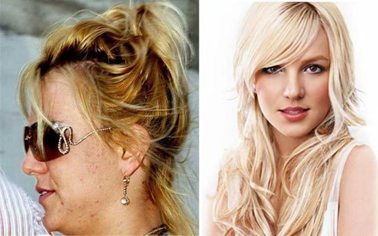 Trong bức ảnh chụp cận mặt, Britney Spears để lộ làn da sần sùi. Cô từng tiết lộ rằng mình bị mụn nghiêm trọng không chỉ ở mặt mà còn ở trên cổ, lưng, ngực và phải dùng tới phương pháp laser để điều trị.