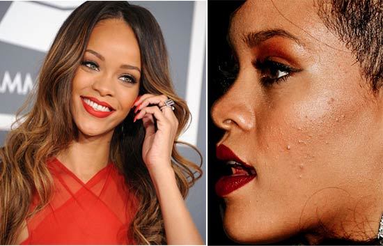 Lớp trang điểm đậm cũng không thể giúp Rihanna che đi những nốt mụn sưng tấy ở hai bên má.