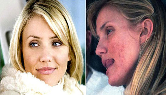 Khi để mặt mộc, Cameron Diaz lộ vùng má dưới rất nhiều mụn bọc sưng tấy.