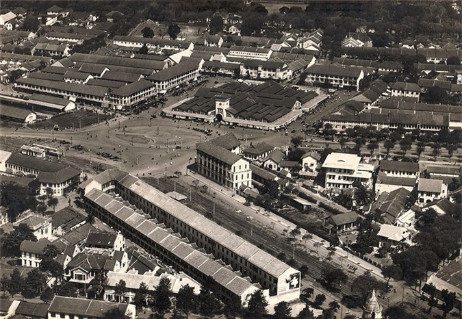 Toàn cảnh chợ Bến Thành thập niên 1920 nhìn từ máy bay. Ảnh: Belleindochine.