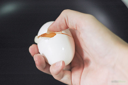 Đập nhẹ lên cạnh bát để vỏ trứng có vết nứt thì dùng ngón tay tách nhẹ hai mảnh vỏ trứng ra theo "nguyên lý bóng bàn" vừa tìm hiểu là xong.