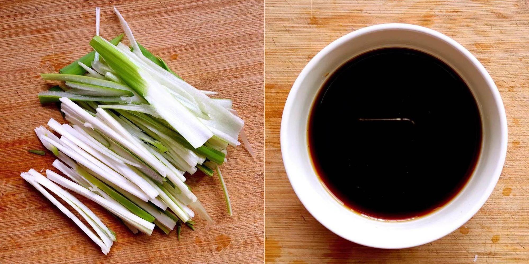 Hành rửa sạch, thái khúc rồi chẻ sợi. Gừng giã nhỏ vắt lấy phần nước cốt. Cho nước tương vào bát, thêm dầu hào, đường, rượu nấu ăn, nước cốt gừng và một ít muối vào hòa tan.