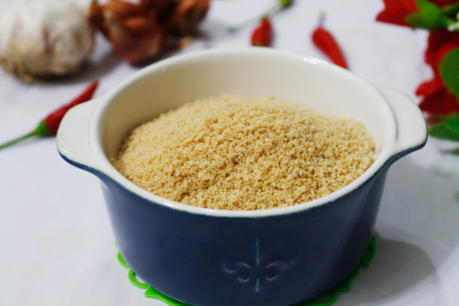 - Bước 5: Đổ bột gà ra chảo rồi đảo liên tục, rang cho bột gà khô ráo hoàn toàn rồi thêm tiêu trắng, bột tỏi, bột hành, muối rang thêm vài phút là tắt bếp, lúc này bột gà sẽ hơi to.