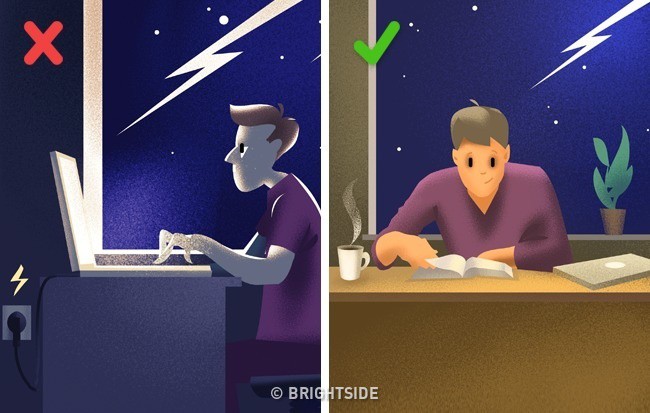 – Nếu trời đang mưa và có nhiều sấm sét, bạn hãy tắt ngay máy tính, rút dây sạc, và rút luôn cả dây cáp Internet. Sấm chớp có thể phóng ra những dòng điện với điện thế cực mạnh, làm hỏng thiết bị của bạn đấy.