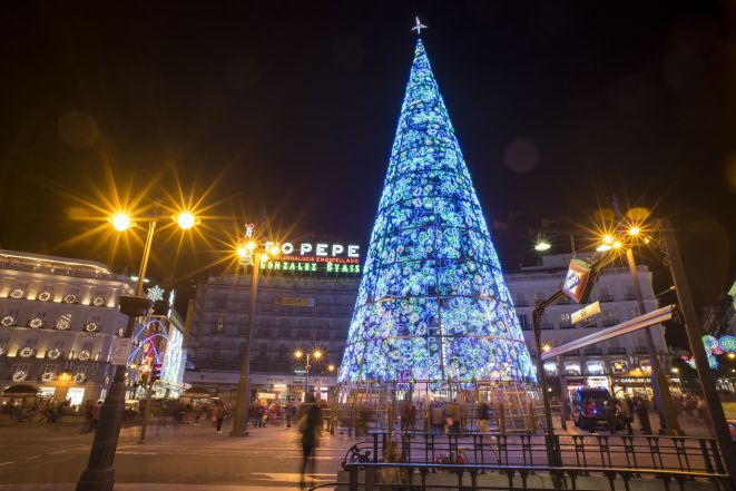 Cây Giáng sinh Puerta del Sol ở thủ đô Madrid của Tây Ban Nha được trang trí rực rỡ với những ngọn đèn neon xanh và chiếu sáng khắp quảng trường thành phố.