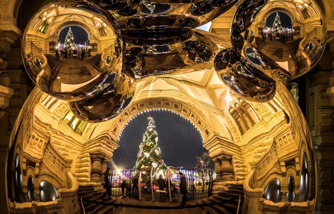 Tại trung tâm thành phố Moscow, một cây thông Noel lộng lẫy như được phản chiếu trong tác phẩm điêu khắc bằng thép không rỉ của Gregory Orekhov.