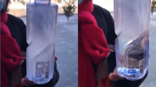 Chai nước đóng băng ngay khi vừa mở nắp. Clip được ghi lại ở khu vực Hulunbuir, Nội Mông (Trung Quốc). Chai nước tiếp xúc với nhiệt độ ngoài trời âm 20 độ C lập tức đông cứng.