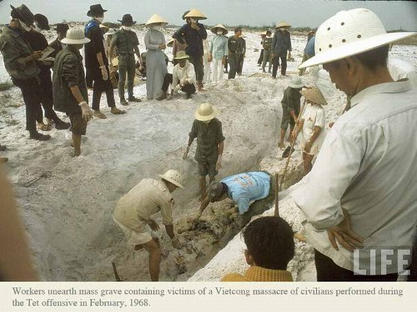 4- Nhưng phải nói trách nhiệm lớn lao nhất của Việt cộng trước Dân tộc, trước Lịch sử chính là cuộc thảm sát thường dân tại Huế trong 25/26 ngày chúng chiếm được thành phố này. Ông Nguyễn Lý Tưởng, nhà sử học, cựu Dân biểu khu vực Thừa Thiên, người đã sống vào thời điểm xảy ra biến cố Tết Mậu Thân ở Huế và các nơi khác cũng như từng tiếp xúc với một số nhân chứng của cả hai bên (Quốc gia lẫn VC hồi chánh), đã kể lại trong “Cuộc hội thảo về chiến tranh Việt Nam tổ chức tại Vietnam Center (Lubbock, Texas, Hoa Kỳ) từ 13 đến 15-03-2008 như sau: “Các nạn nhân bị thảm sát tại Huế và Thừa Thiên được tìm thấy tại trường tiểu học Gia Hội, chùa Theravada, Bãi Dâu, Cồn Hến, Tiểu Chủng viện, khu vực phía Tây Huế gần lăng Tự Đức và lăng Đồng Khánh, cầu An Ninh Thượng, cửa Đông Ba, trường An Ninh Hạ, trường Văn Chí, chợ Thông, Lang Xá Cồn, gần lăng Gia Long, gần chùa Tường Vân, Đông Gi (Di), Vinh Thái, Thủy Thanh, Lương Viện, Phù Lương, Phú Xuân (Phú Thứ), Thượng Hòa, Vinh Hưng, Khe Đá Mài… tất cả 23 địa điểm tổng cộng 2326 xác chết (sọ người). Còn khoảng trên 3,000 nạn nhân thuộc tỉnh Thừa Thiên và Huế đã được thân nhân xác nhận là chết hoặc bị bắt đi thủ tiêu, mất tích… không biết họ đã bị giết chết và chôn xác ở đâu?!