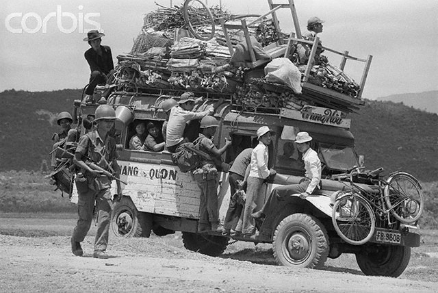 Binh lính Sài Gòn áp tải một xe khách chở đầy người di tản cùng hàng hóa rời khỏi Đà Nẵng ngày 8.3.1974. Hình ảnh được đăng tải trên trang Corbis.