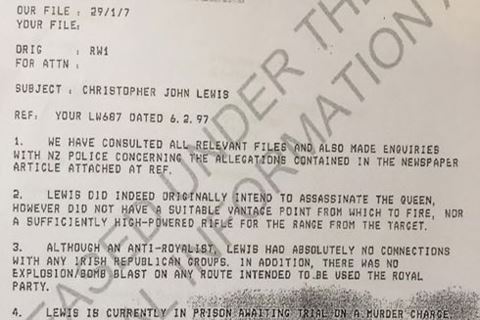 Năm 1995, khi 31 tuổi, Lewis được trả tự do khi chuyến viếng thăm của Nữ hoàng đến Thủ đô Auckland chuẩn bị diễn ra. “Lewis tuyên bố mình đã hoàn toàn thay đổi”, một bản báo cáo được giải mật cho biết. Tuy nhiên, cảnh sát tỏ ra hoài nghi vì những hành vi tâm thần của Lewis trong quá khứ. Họ có ý định giữ liên lạc hàng ngày trong thời gian Nữ hoàng Anh ở thăm Auckland.