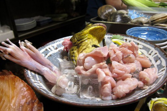 Sashimi ếch được đánh giá là có hương vị lạ miệng, rất ngon. Tuy nhiên, trên khắp nước Nhật Bản chỉ có vài nhà hàng được phép bán. Thông thường ếch sẽ được lọc bỏ da, lọc lấy phần thịt ngon nhất, ăn kèm với nước tương và vài lát chanh.